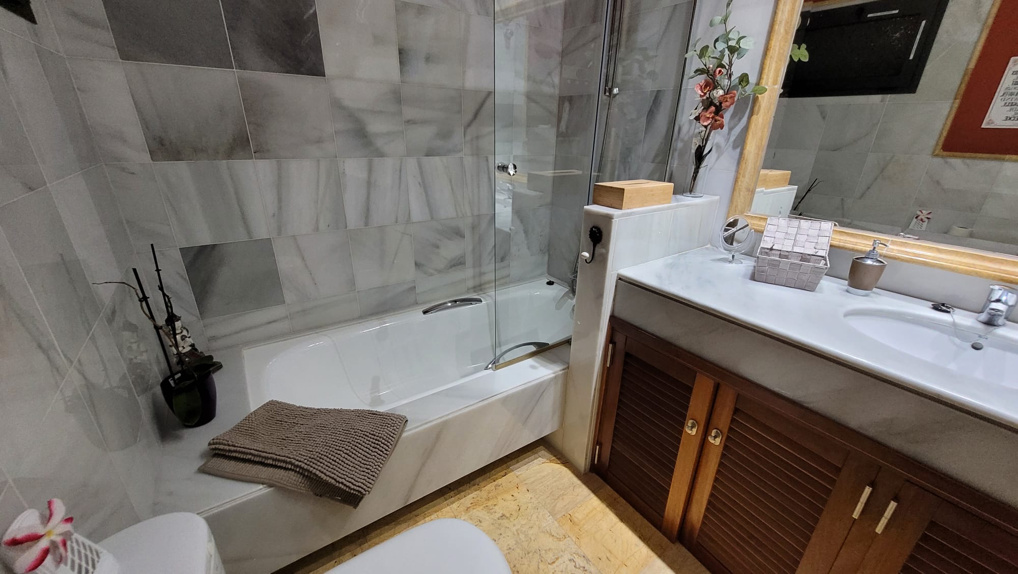 | Schlafzimmer 1 Mit Doppelbett ( neue Matrazen) Nachtkästchen, gute Leselampen sowie eine Garderobe. Zugang zur Terrasse sowie ein en-suite Badezimmer in Marmor gehalten mit Badewanne. Großer Schrank mit viel Stauraum. ![]() | ![]() |