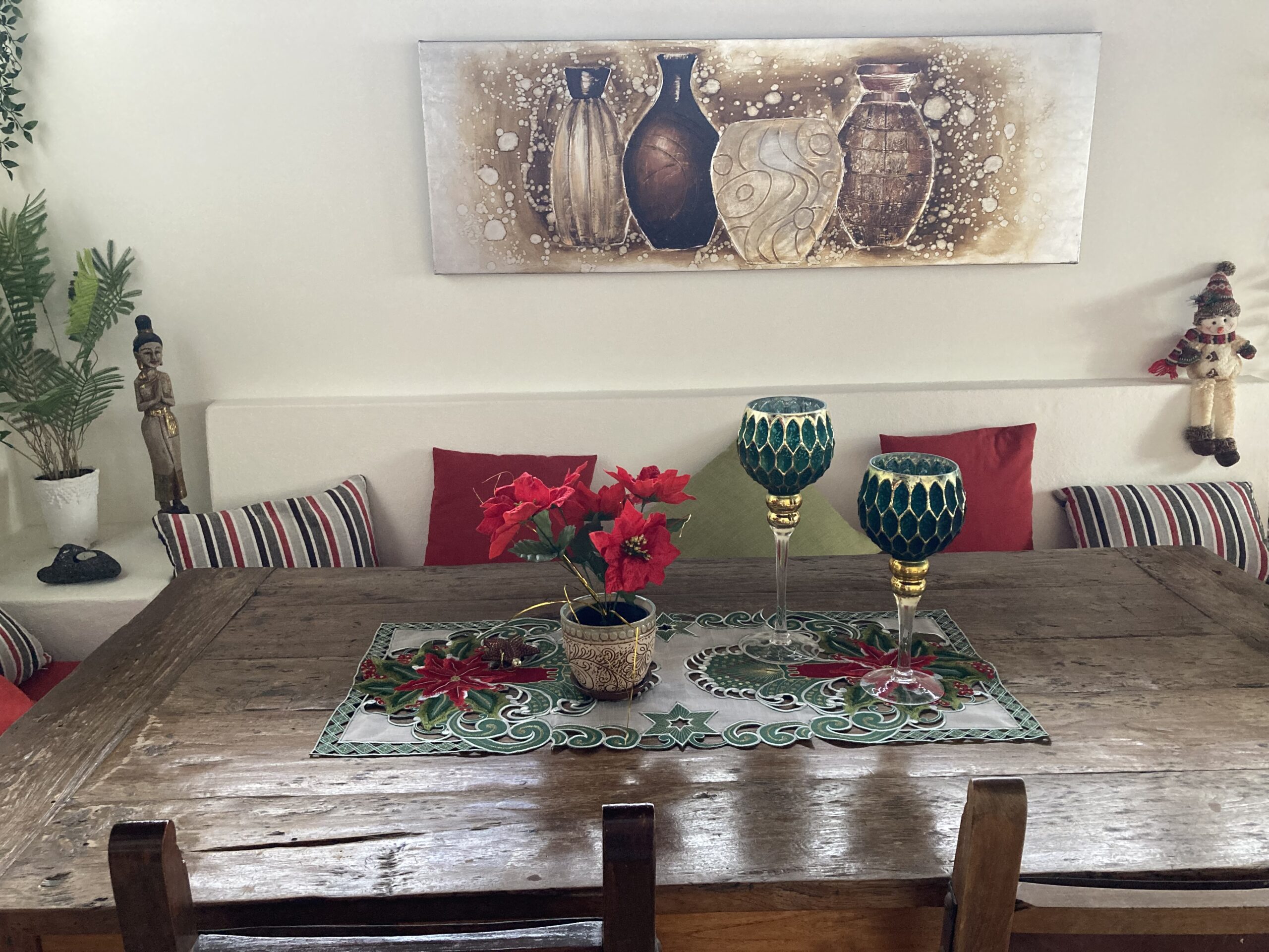 | Esszimmer Großer Esstisch mit gemütlicher Eckbank und Stühle im kanarischen Stil – Ambientebeleuchtung für die Abendstimmung ![]() ![]() | ![]() ![]() |